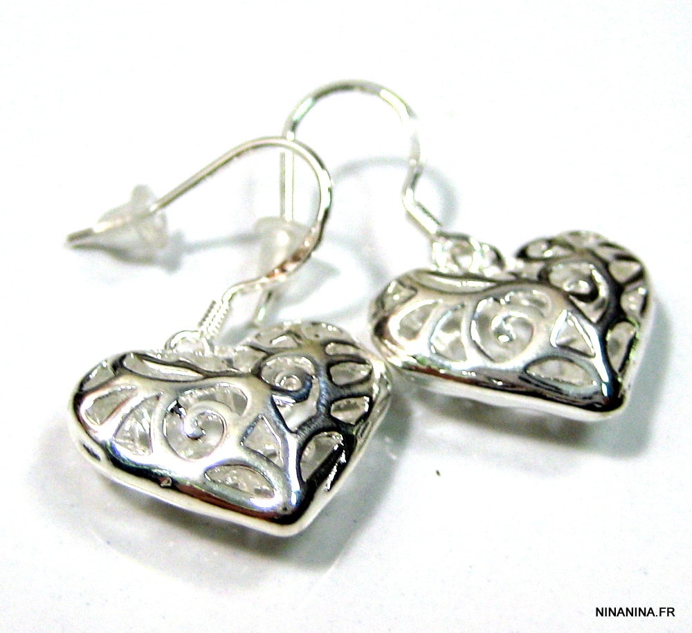 Boucles d’oreilles plaqué argent composées d’un pendentif coeur filigrané en plaqué argent monté sur boucle pendante. Dim du pendentif : 1,6 X 1,6 cm environ. Longueur totale (boucle comprise) : 3 cm. Livrées avec embouts stoppeurs en silicone. Poids : 3,9 g. Livré dans sa pochette d’organza.
