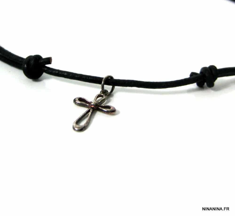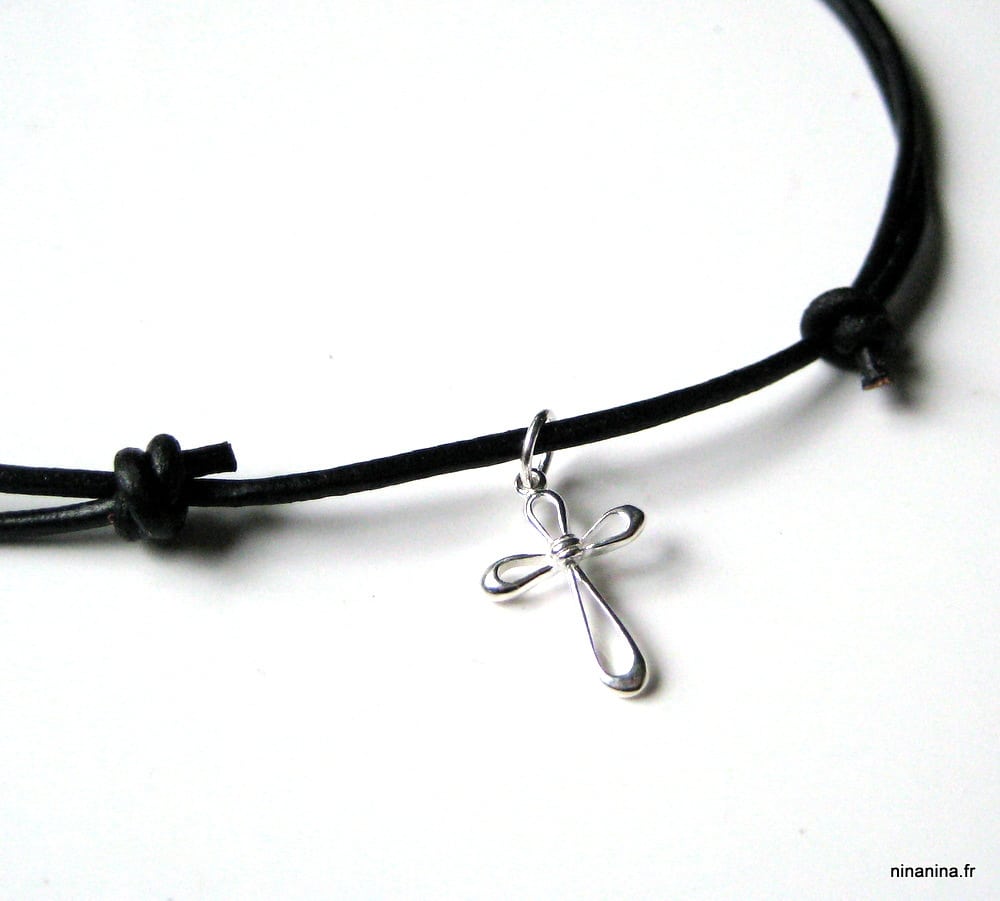Collier homme cordon cuir croix argent massif composé d’une croix en argent 925 montée sur un double cordon de cuir noir.